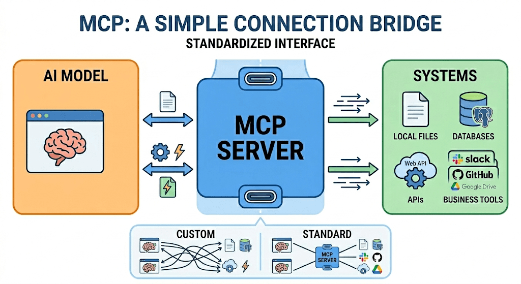 MCP solves this by standardizing the interface. It's a protocol — not a product — that defines a universal way for AI models to connect to external data sources and tools. Think of it as USB-C for AI: one standard port, any device. An agent that speaks MCP can connect to any MCP-compatible server without bespoke integration work.